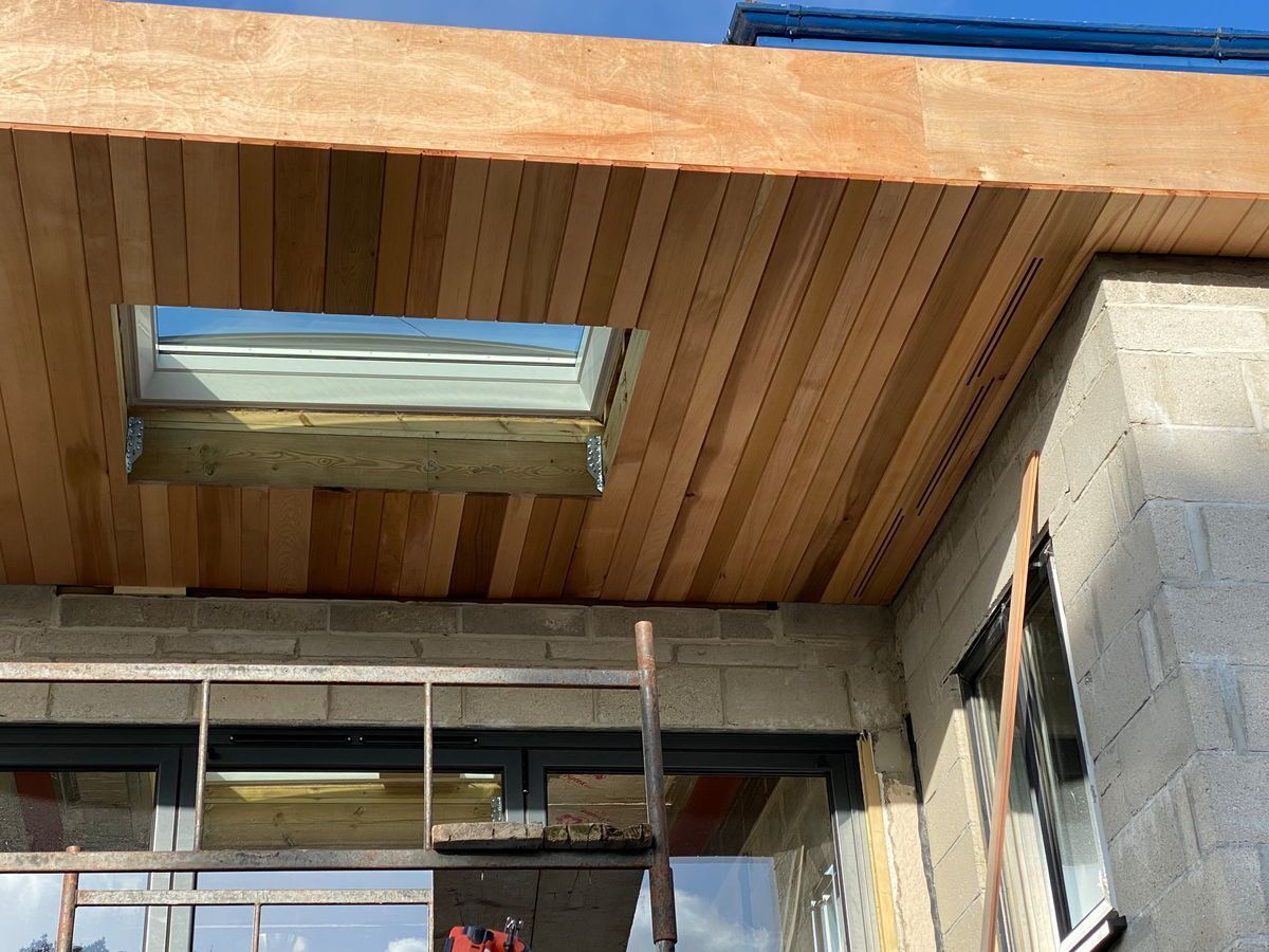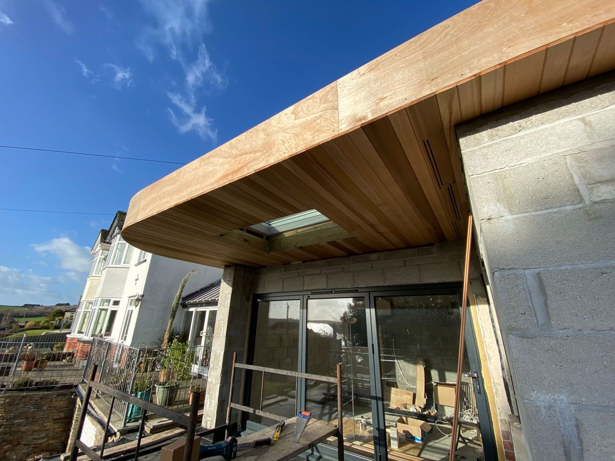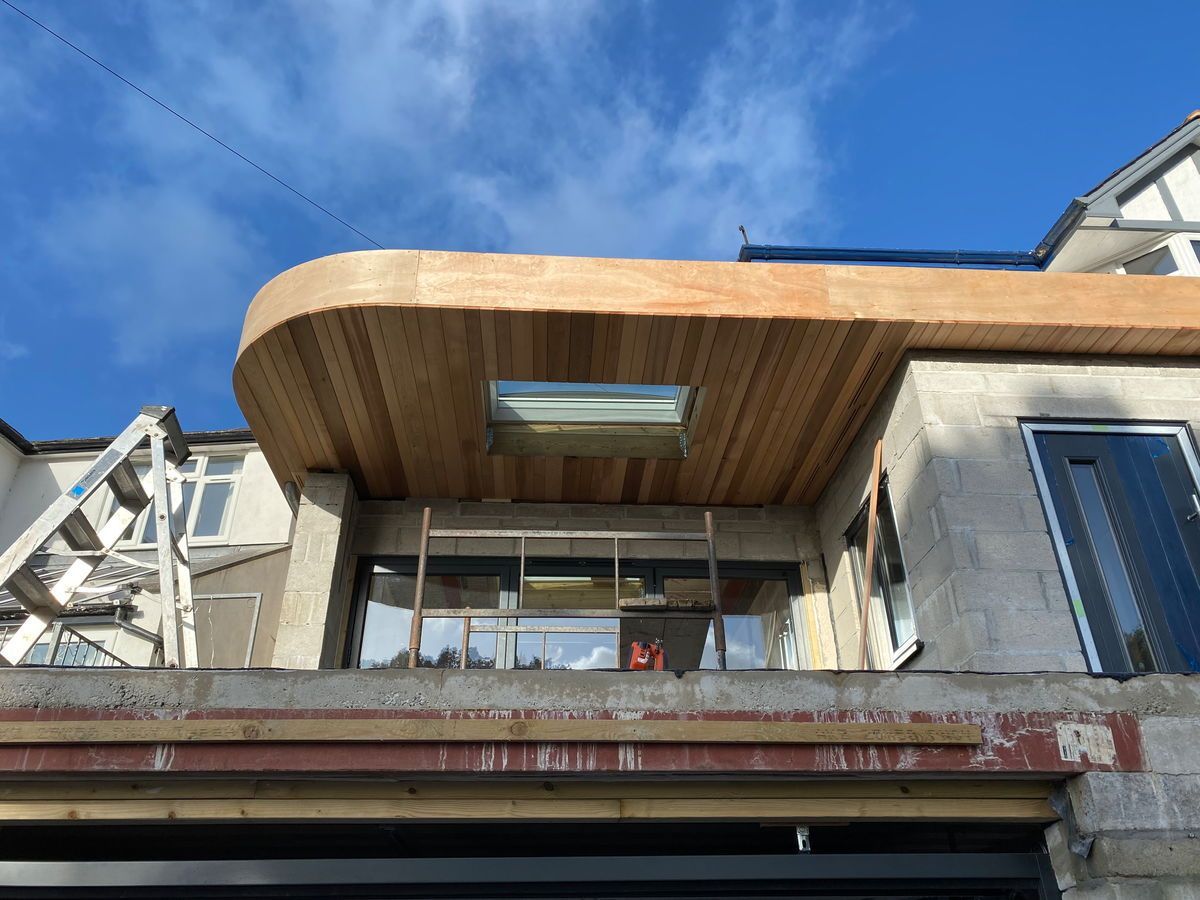 As part of an extension on a property in Kingsbridge we are contracted in to provide a solution for their roof. We created a cedar clad, curved flat roof design with tongue and groove soffits, integrated fixed skylight and custom made bespoke vents.